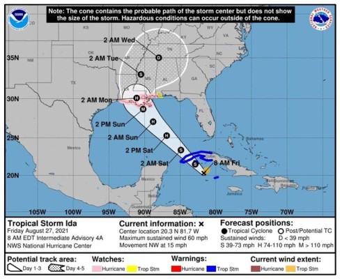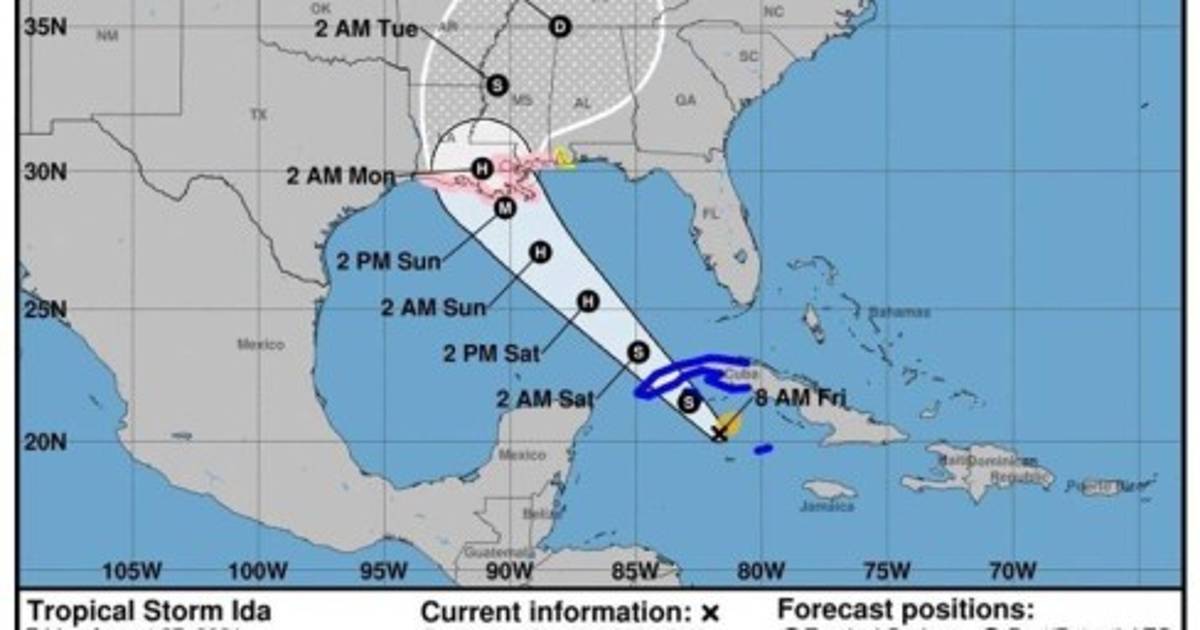 Ida se sitúa a 50 kilómetros al este de la Isla de la Juventud, en Cuba, y se desplaza hacia el noroeste con vientos máximos sostenidos de unos 120 km/h. El domingo podría tocar tierra en Luisiana, según las previsiones del centro meteorológico.