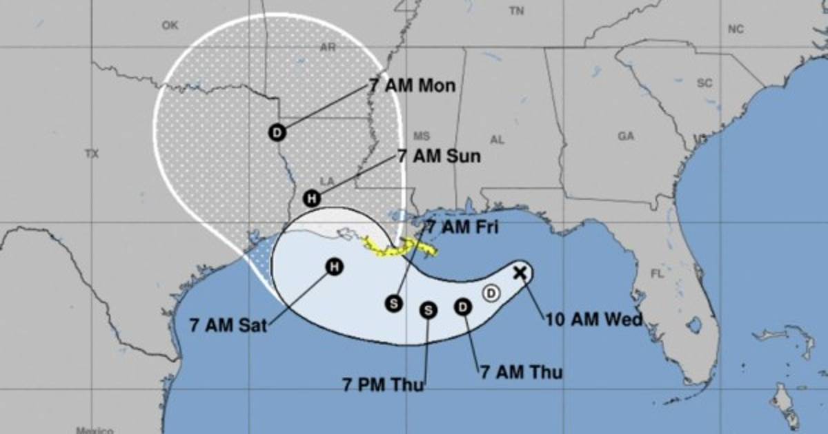 Durante el fin de semana se aproximará a la parte central de la costa estadounidense del Golfo fortalecido. El patrón de trayectoria muestra el cono del huracán abarcando gran parte de la costa de Luisiana y la linde con Texas.
