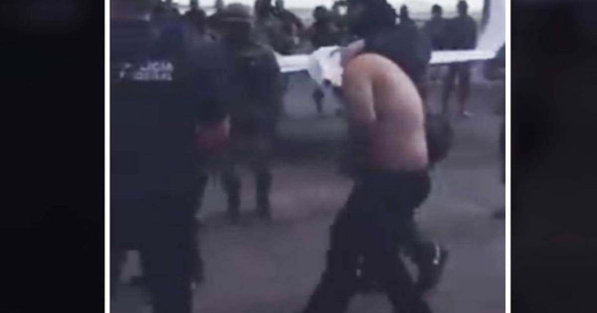 El capo lleva cubierta su cara con la camisa, con torso desnudo y pantalón negro mientras es subido al jet fuertemente custodiado por militares.