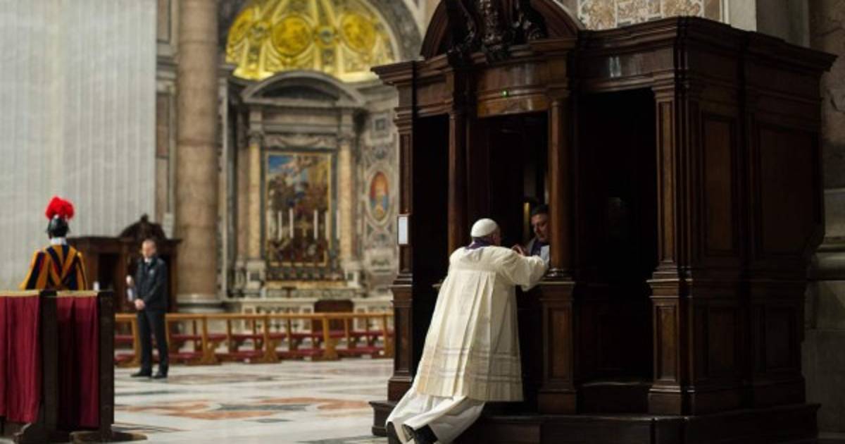 El Papa descendió del altar de la Basílica, bajo el baldaquino barroco, y tras quitarse la capa pluvial morada, símbolo de preparación cuaresmal, acudió a uno de los confesionarios de la nave central, ante el que se arrodilló.