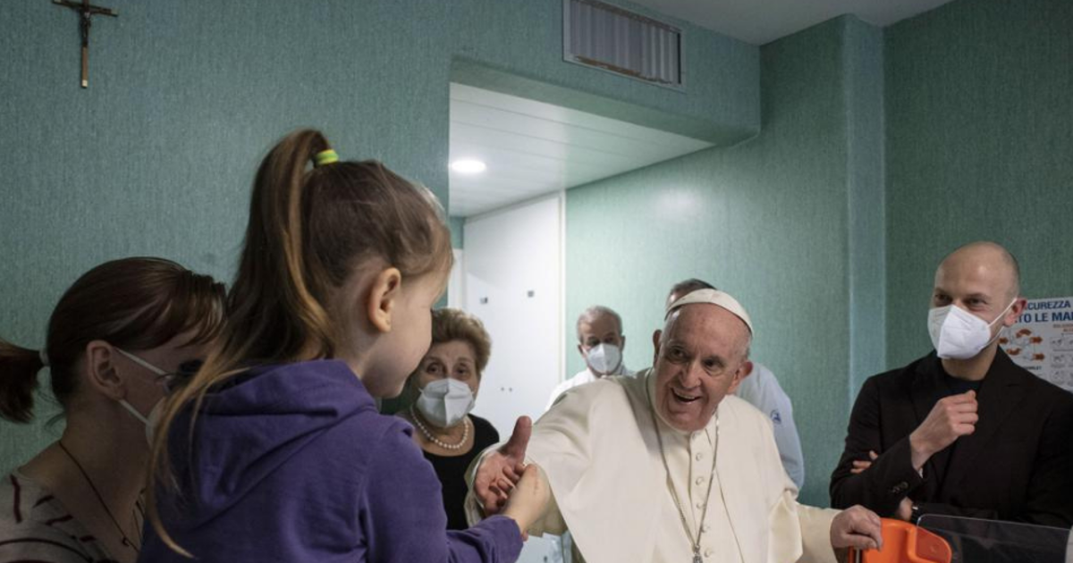 Sobre las 16.00 horas, Francisco visitó por sorpresa la planta donde se encuentran los niños hospitalizados que han llegado desde Ucrania, muchos de ellos pacientes oncológicos, pero también algunos pequeños que han sufrido heridas por los bombardeos rusos.