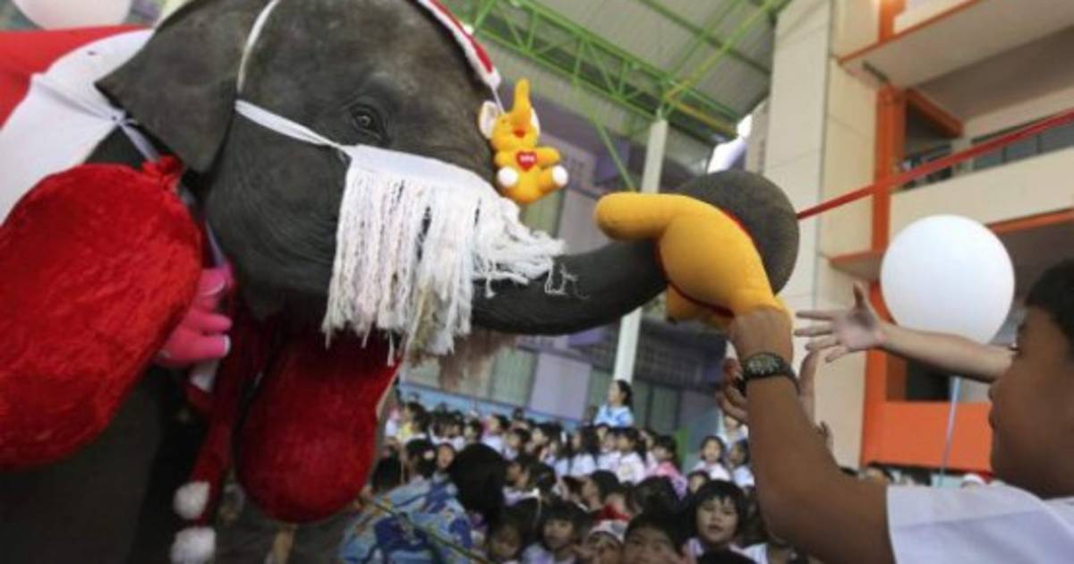 Un elefante tailandés vestido de Santa Claus reparte regalos entre los niños de un colegio en Ayutthaya. El evento se celebra cada año para festejar la llegada de la Navidad y para promocionar el turismo en la ciudad.