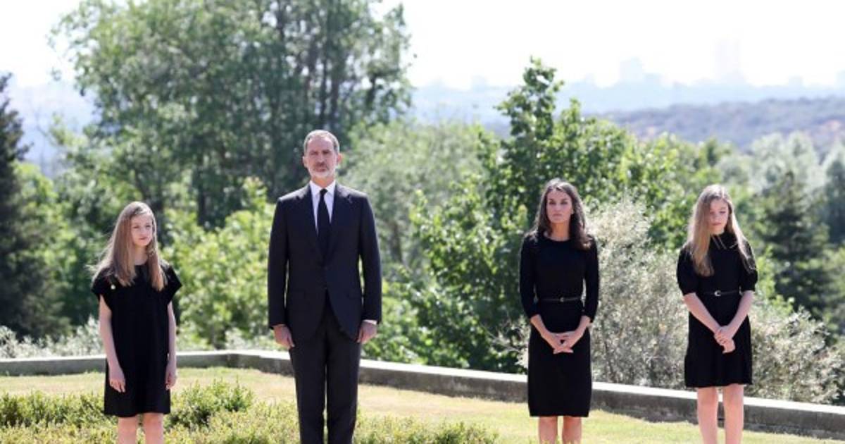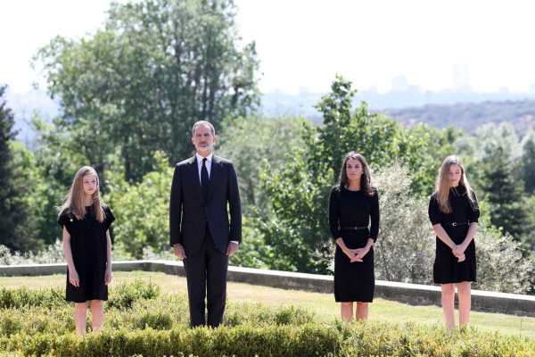 Los reyes Felipe y Letizia, y sus hijas, la princesa de Asturias y la infanta Sofía, vestidos de luto riguroso, permanecieron en silencio frente a la fachada del edificio principal del Palacio de la Zarzuela, en Madrid, ante una bandera de España a media asta.