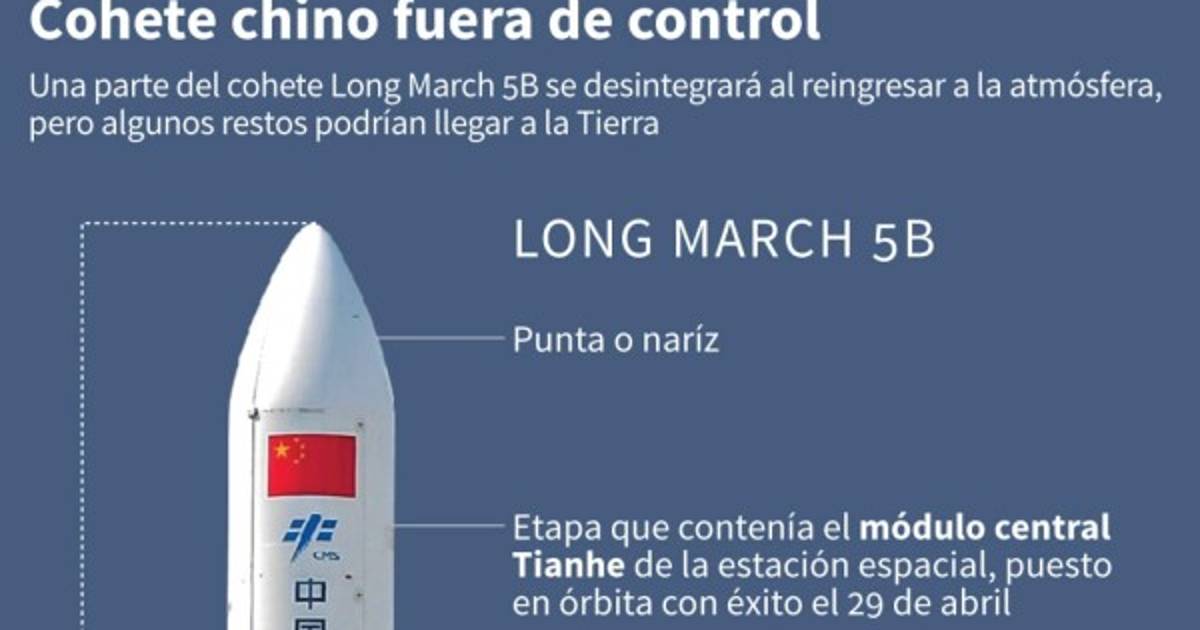 Los expertos del Pentágono esperan que el cohete Long March 5B, que cayó fuera de órbita tras separarse de la estación espacial de Pekín, caiga en la superficie en algún momento entre el sábado y domingo.