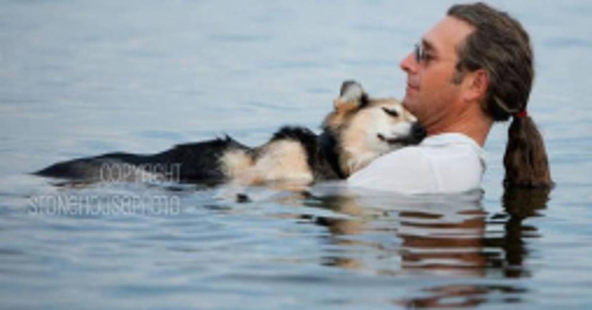 La historia de Schoep y su dueño John Unger, una familia muy singular que saltó a la fama luego de que en Facebook apareciera una foto del hombre con su perro de 19 años reposando en un lago.