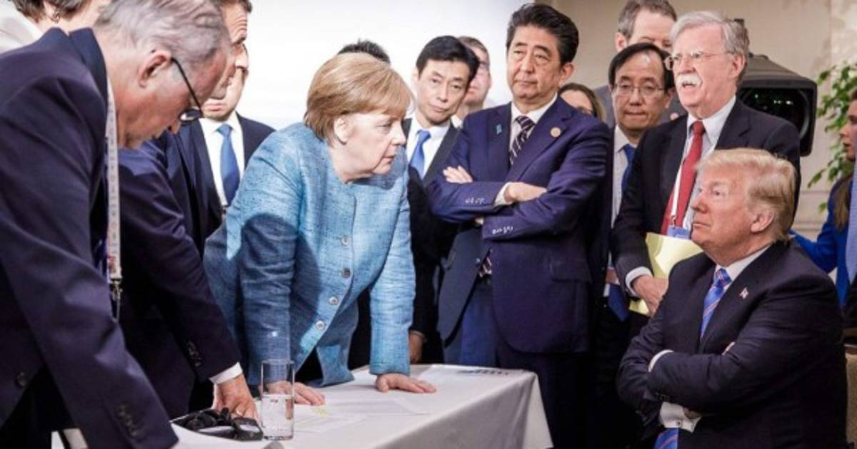 La imagen, publicada en la cuenta de Instagram de la canciller alemana, Ángela Merkel, la muestra de pie, en una postura desafiante frente al mandatario estadounidense, el único que está sentado en el grupo.