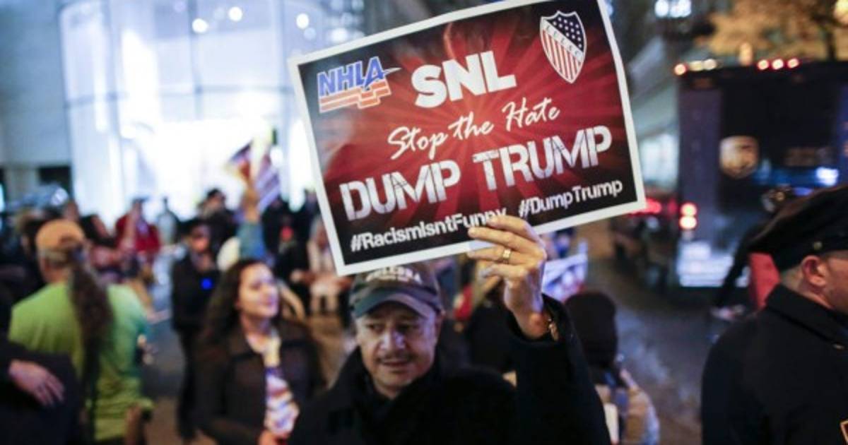 Un grupo de hispanos indignados realizaron una protesta en Nueva York, Estados Unidos, exigiendo a la cadena NBC que revoque la invitación al aspirante republicano a la Casa Blanca, Donald Trump, como anfitrión del programa 'Saturday Night Live' (SNL) el próximo sábado.