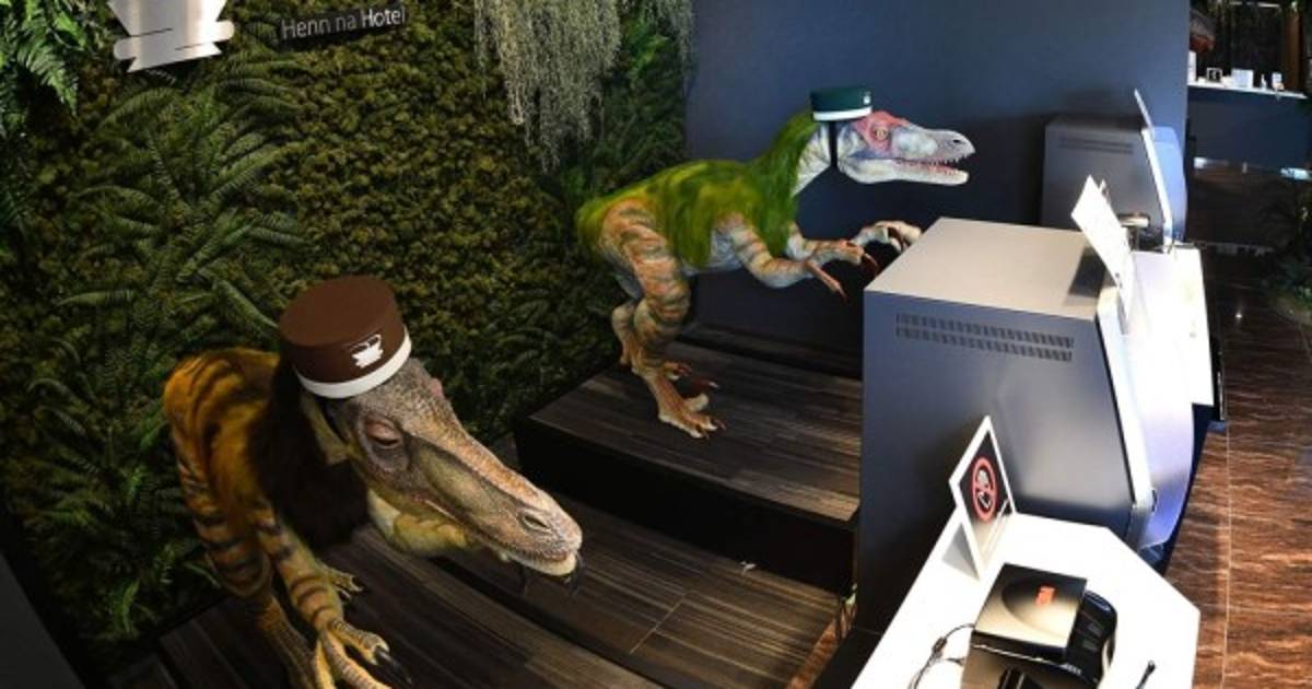 Dos dinosaurios, que parecen salidos del Parque Jurásico, tocados con un quepí de mozo de equipajes, surgen de pronto, alertados por un detector de movimientos, e invitan al cliente a registrarse en una pantalla táctil.
