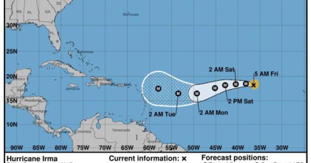 Se desplaza ahora hacia el oeste con una velocidad de traslación de 20 km/h y según un probable patrón de trayectoria, Irma girará hacia el oeste-suroeste el sábado.