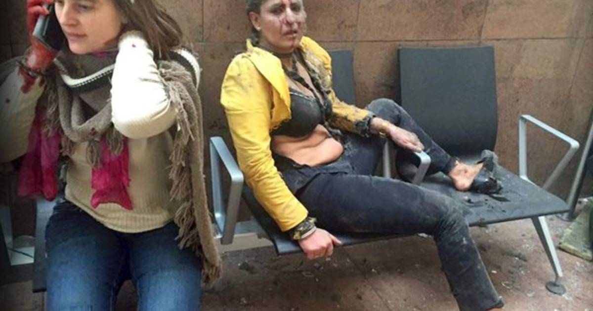 Otra foto que este miércoles apareció en portadas de todo el mundo es la de una mujer sentada en un banco del aeropuerto, llena de polvo, con la ropa hecha jirones, sangre en el rostro, y mirada de consternación.