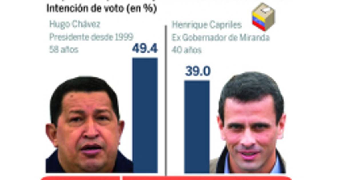 El presidente venezolano Hugo Chávez cuenta con 49.4% de intención de voto ante 39% para el opositor Henrique Capriles y hay 11.6% de indecisos que serán claves en las elecciones del 7 de octubre, según un sondeo de la reputada firma Datanálisis difundido ayer.