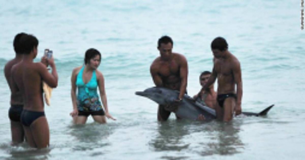 En las imágenes publicadas en línea se puede a un grupo de turistas levantando al delfín que encalló en una playa de la isla meridional de Hainan. El delfín, que posiblemente fue herido antes en una coalición con un barco, murió poco después de una hemorragia, informó el martes el diario Shanghai Daily. Varios internautas denunciaron la actitud de los turistas, que prefirieron posar junto al animal en lugar de asistirlo.