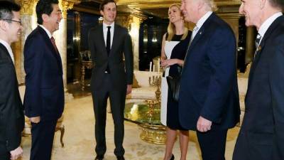 Ivanka Trump con el primer ministro japonés Shinzo Abe, su marido Jared Kushner que quiere participar en las reuniones diarias sobre seguridad en la Casa Blanca: la familia de Donald Trump es omnipresente y alimenta los temores sobre los conflictos de interés y la falta de experincia.