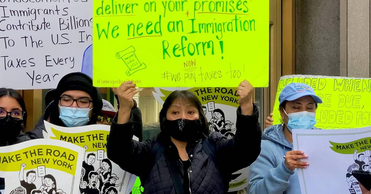 “Cumplimos con nuestros impuestos pero seguimos excluidos” gritaban frente a la sede de la Dirección de Impuestos Internos (IRS por siglas en inglés) en Manhattan y portaban carteles con mensajes como “Presidente Biden, cumpla su promesa. Necesitamos una reforma migratoria”.