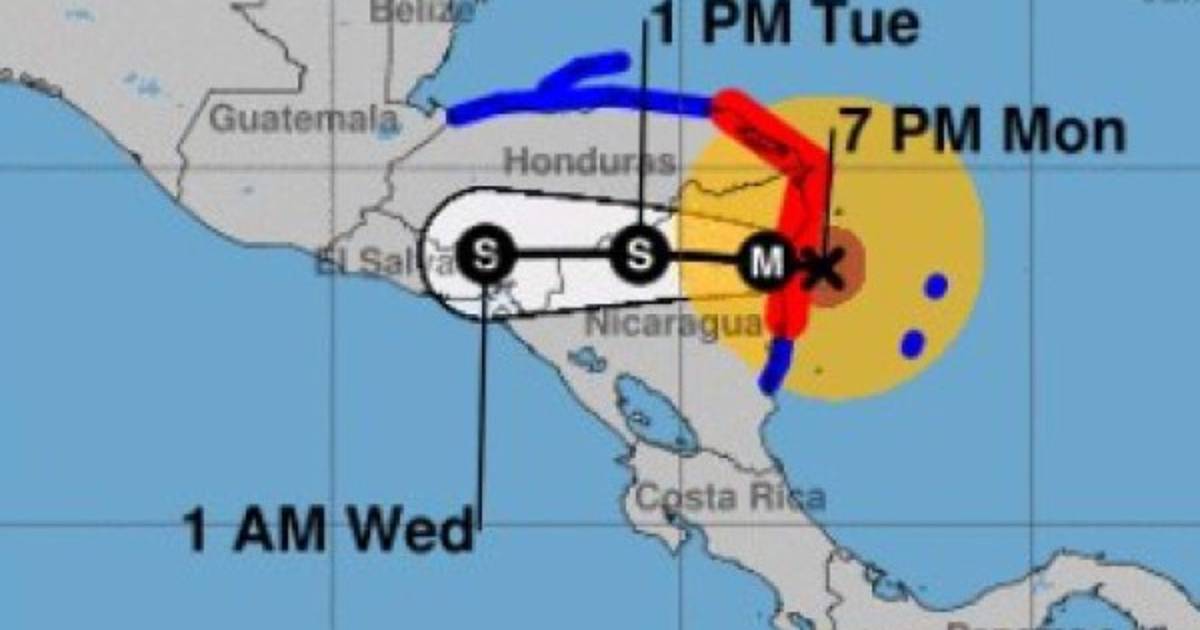 Hay un aviso de huracán que afecta a la costa de Nicaragua desde el sur de la bahía Sandy hasta Bluefields y en la costa norte de Honduras, desde el oeste de Punta Patuca hasta la frontera con Guatemala.
