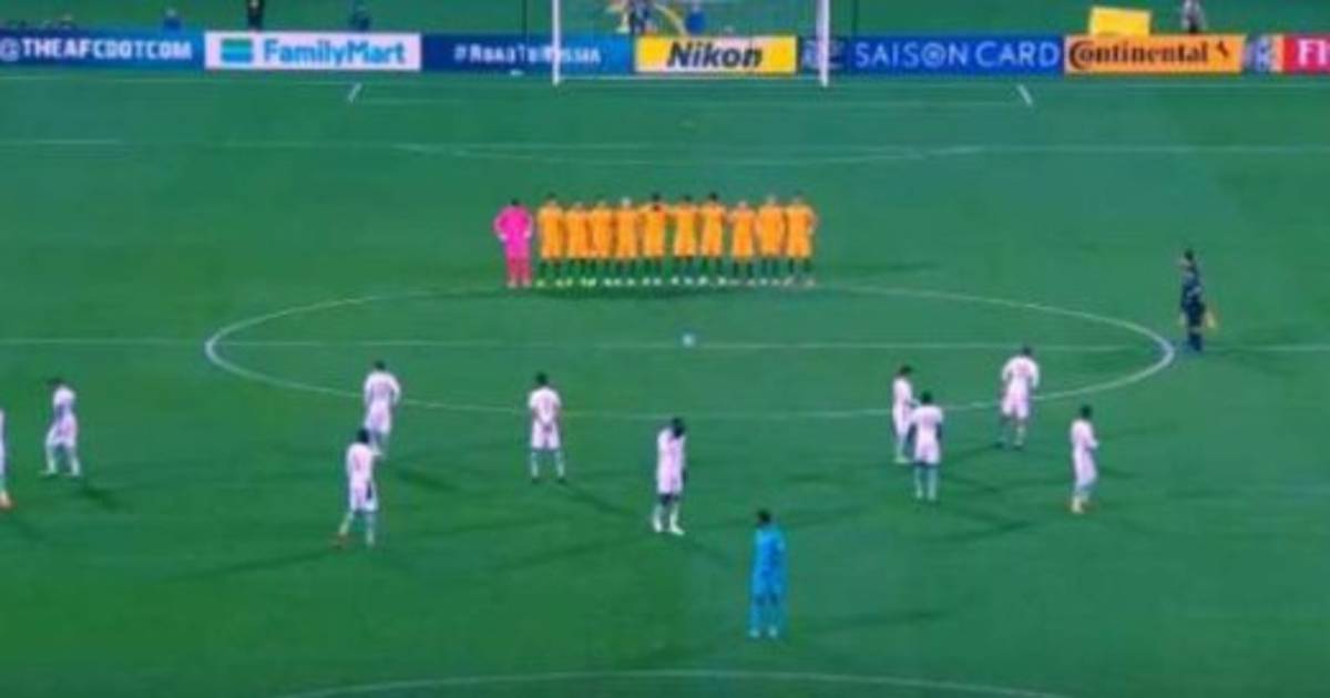 Los jugadores australianos reunidos en el campo de juego se alinearon correctamente, mientras que los jugadores de Arabia Saudí decidieron caminar por el terreno de juego.