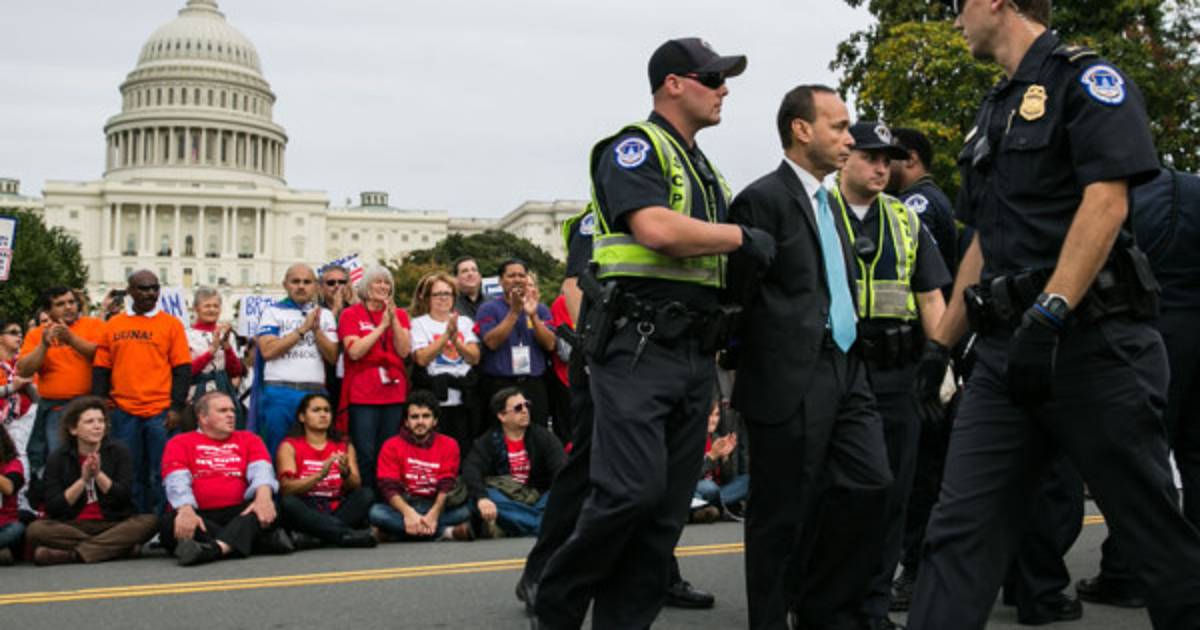 Los congresistas, todos demócratas, formaron parte de cerca de 200 activistas cívicos, religiosos y comunitarios que fueron esposados y arrestados por la Policía de Parques por bloquear el tráfico frente al Capitolio.