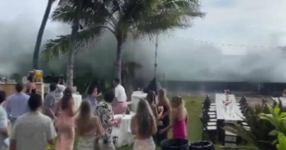 Imágenes compartidas en redes sociales mostraron una ola gigante arrasar un banquete de bodas en el Hulihe’e Palace de Kailua-Kona.