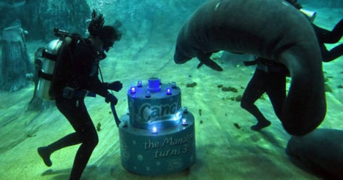 Una docena de pequeños manatíes de la tribu de Canola se incorporaron al festejo, en el cual se deleitaron con trozos de pastel en el acuario.
