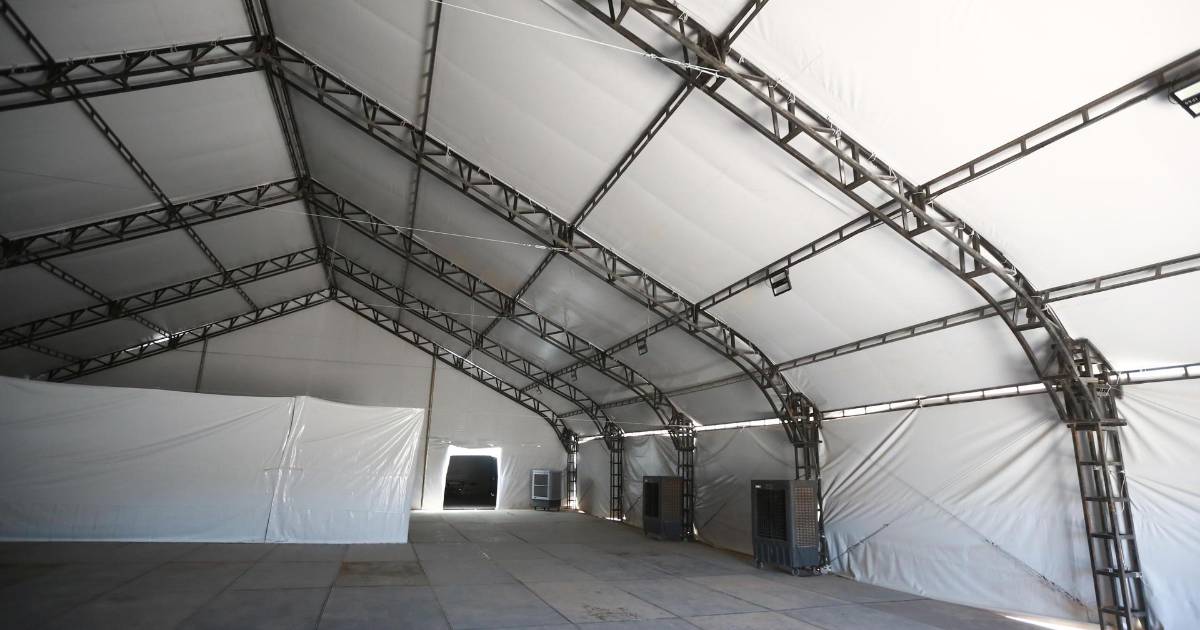 El albergue que construyen las autoridades migratorias está a 72 kilómetros de Ciudad Juárez, y consta de una carpa gigantesca y baños de plástico en unas instalaciones que fueron usadas como aduana antes, pero están abandonadas y vandalizadas desde hace más de 10 años.