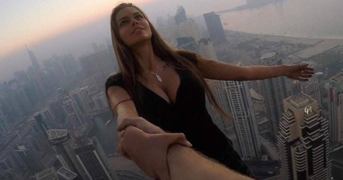 La modelo rusa Viki Odintcova, de 23 años, arriesgó su vida en una sesión fotográfica en Dubái al suspenderse en el aire, agarrada solo de la mano de un asistente.