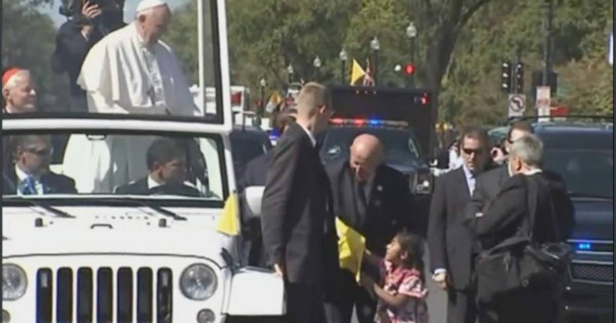 Sofía Cruz, una niña de cinco años, interrumpió este miércoles la caravana donde se transportaba el papa Francisco, quien está de visita por cuatro días en Estados Unidos.