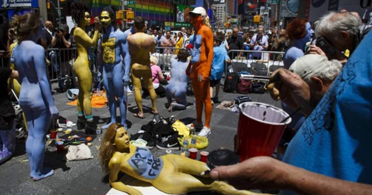 Nudistas lucen mensajes de aceptación en su cuerpo en Nueva York