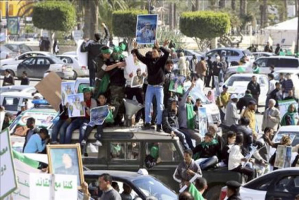 El “Guía de la Revolución” libia, de 68 años, arengó a la multitud en la Plaza Verde de Trípoli, en momentos en que sus fuerzas reprimían ferozmente los focos insurreccionales al oeste de la capital. El cerco sobre Gadafi se estrechaba también desde el exterior, en medio de una andanada de críticas por la feroz represión del levantamiento popular que estalló el 15 de febrero.