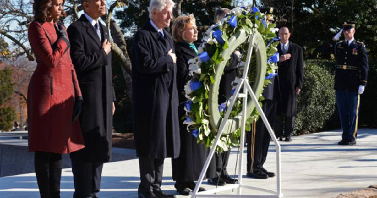 Los Obama y los Clinton, acompañados de algunos miembros del clan Kennedy, depositaron una corona de flores en la tumba en el cementerio de Arlington, a las afueras de Washington y donde están enterrados los cuerpos de más de 300.000 soldados estadounidenses fallecidos en combate.