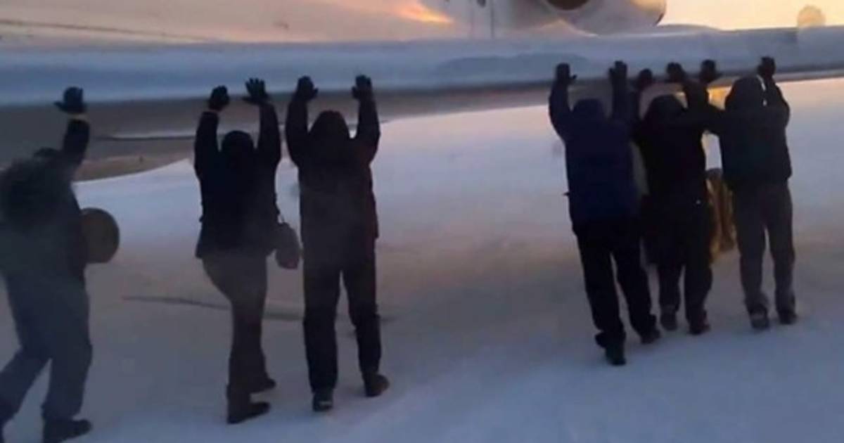 El avión había estado guardado durante 24 horas en la pista del aeropuerto, por lo que las ruedas del vehículo quedaron congeladas al piso. En la grabación de YouTube puede verse al grupo de pasajeros, trabajadores que regresaban a la capital regional, bajarse del vehículo para ‘empujar’ al aeroplano por sus alas.