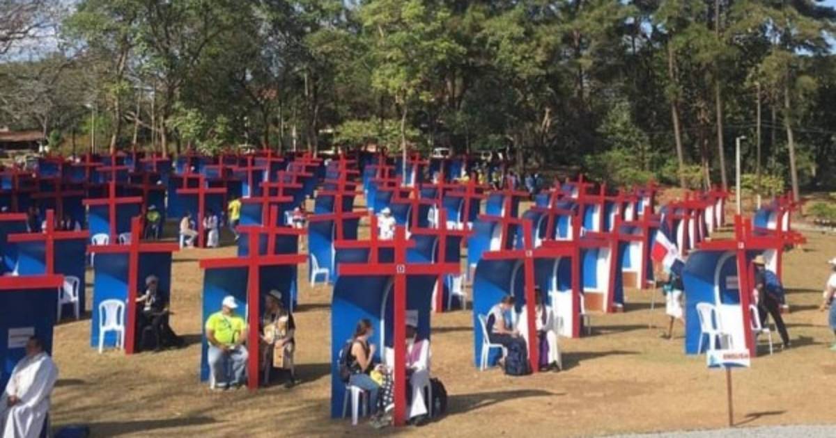 Centenares de peregrinos buscaron aliviar su conciencia antes de la llegada del papa Francisco, arrodillados en 250 confesionarios fabricados por presos e instalados en un parque de Ciudad de Panamá.