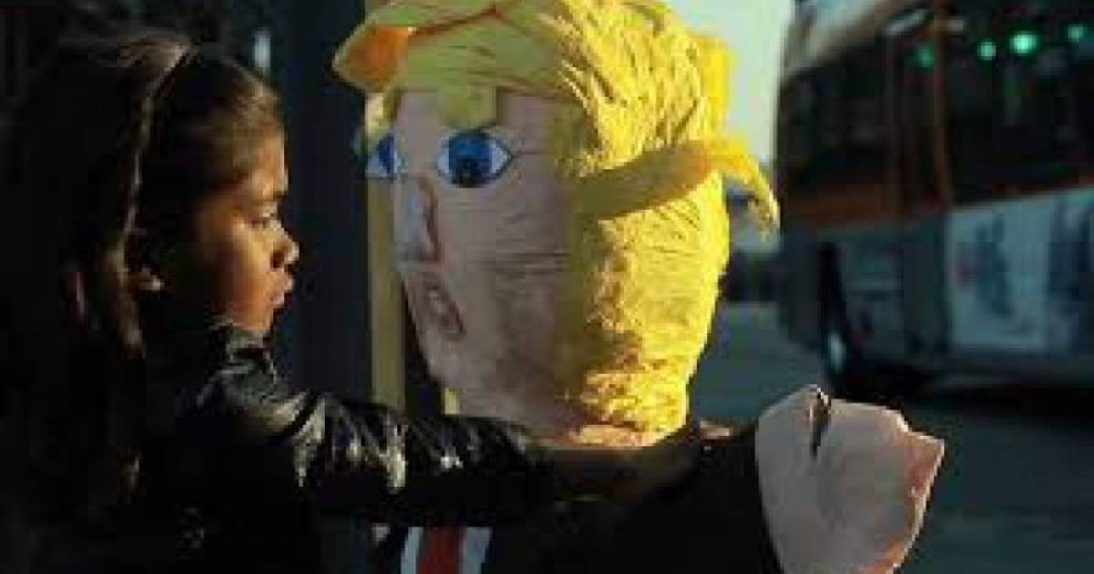 Una niña arrastra hasta un basurero una piñata del candidato republicano a la Presidencia de Estados Unidos, Donald Trump.