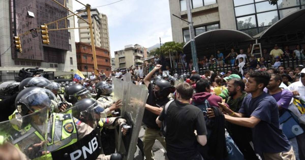 Armadas con escudos, chalecos y cascos, los policías formaron una barricada en un sector cercano a Plaza Venezuela, donde se habían concentrado los opositores para emprender la marcha hacia el centro de la capital, a las oficinas del Consejo Nacional Electoral (CNE), constataron periodistas de AFP.