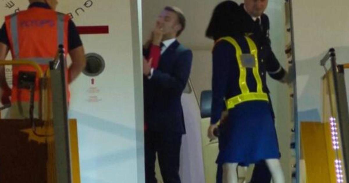 Emmanuel Macron da un cuarto de giro por el empujón de la mano de su mujer, se da cuenta entonces de que la puerta está abierta y de que lo que ha ocurrido se ha visto desde el exterior de la aeronave y lanza un saludo con una sonrisa.