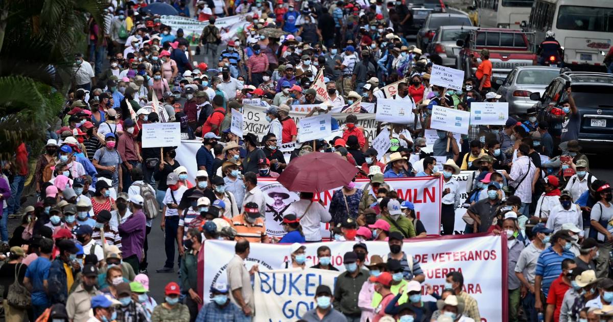 En la marcha, veteranos de la guerra civil salvadoreña (1980-1992), usando viejos uniformes verde olivo se amarraron cintas en su cabeza con la leyenda “no al bitcoin” y quemaron petardos.
