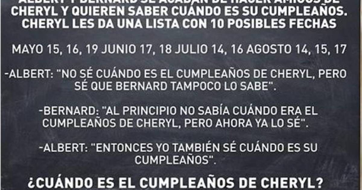 El reto consiste en adivinar la fecha de cumpleaños de Cheryl. Y Cheryl da de antemano una lista de 10 posibles fechas: el 15, 16 o 19 de mayo; el 17 o 18 de junio; el 14 o 16 de julio; o el 14, 15 o 17 de agosto. Sin embargo, y para mantener la ambigüedad de la adivinanza, le dice el mes y el día en que nació a Albert y a Bernard separadamente. Mientras que la conversación entre ambos es la que sigue: