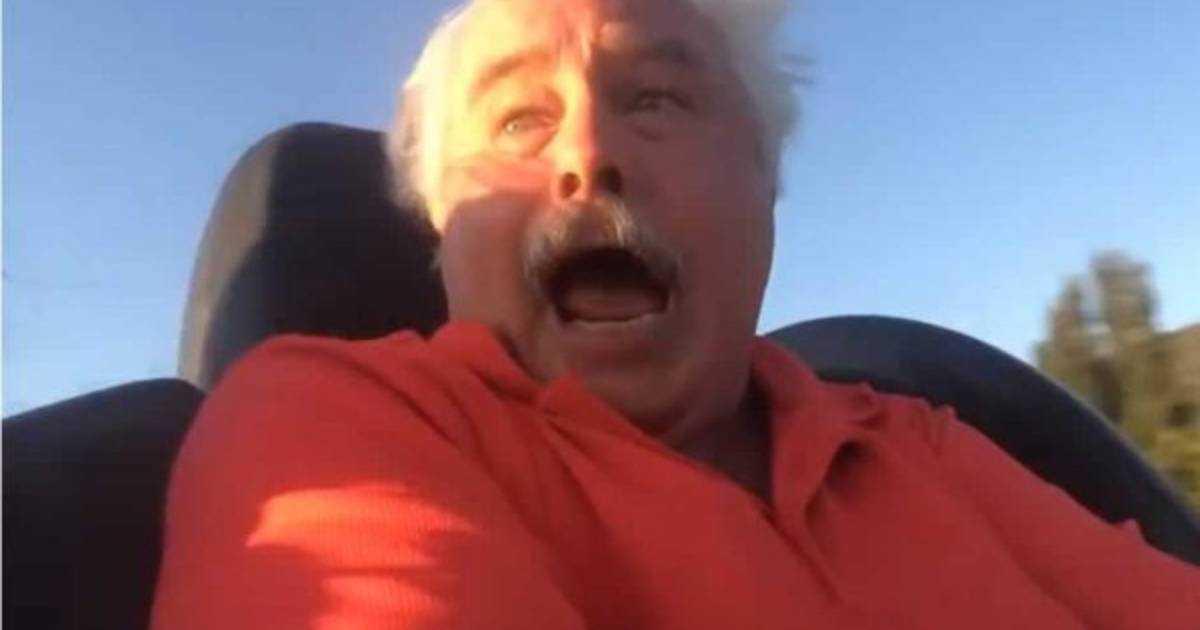 Un padre de familia fue grabado mientras disfrutaba el subirse por primera vez a una montaña rusa.