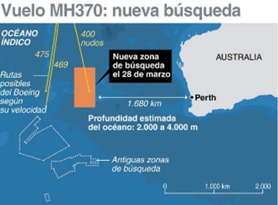 La nueva zona de búsqueda tiene una superficie de aproximadamente unos 319.000 kilómetros cuadrados y se encuentra a 1.850 kilometros al oeste de Perth, la gran ciudad del occidente de Australia. AFP
