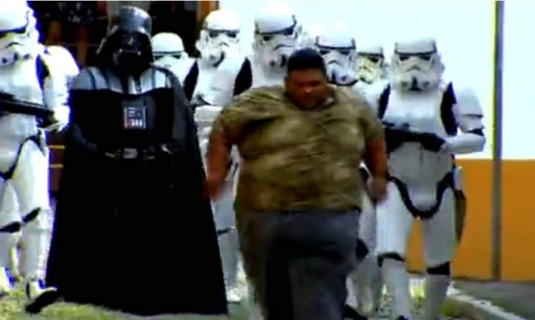 El momento cuando una de las víctimas de la broma corre tras ser perseguido por los que se visten como personajes de Star Wars. Foto YouTube.