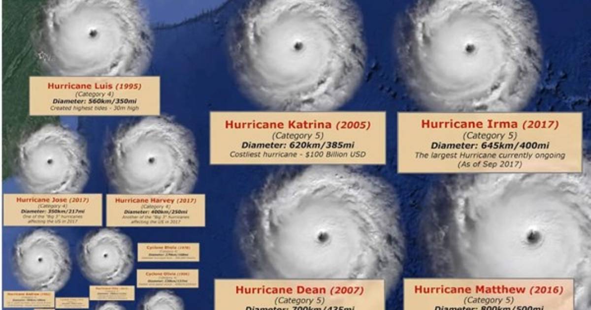 El ciclón Olivia (1996), por ejemplo, medía 220 kilómetros de diámetro y sus vientos alcanzaron los 409 km/h, los más rápidos nunca registrados. El huracán Harvey (2017), por su parte, tenía 400 km de diámetro y también era categoría 4, pero sus vientos fueron menores.