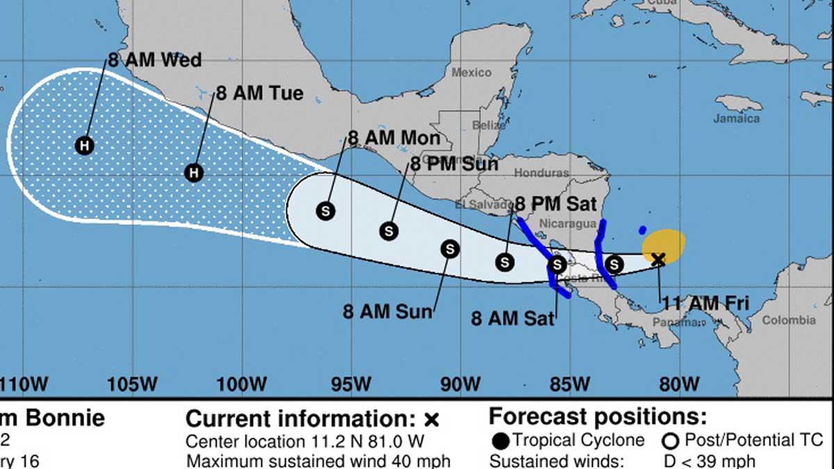 Bonnie, que empezó su trayectoria en la parte sur de las islas de Barlovento y siguió por el Caribe cerca de las costas de Venezuela y Colombia, se encuentra a unas 100 millas (160 km) al este-sureste de Bluefields (Nicaragua) y se desplaza hacia el oeste con una velocidad de traslación de 17 mph (28 km/h).