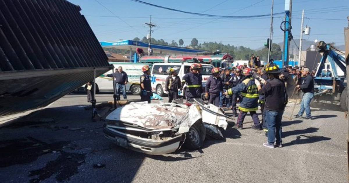 El accidente, registrado en el municipio de Salcajá, en el departamento occidental de Quetzaltenango, sucedió frente al Monumento al Migrante, donde el contenedor de un cabezal cayó encima de un automóvil sedan blanco por causas que no fueron aclaradas.