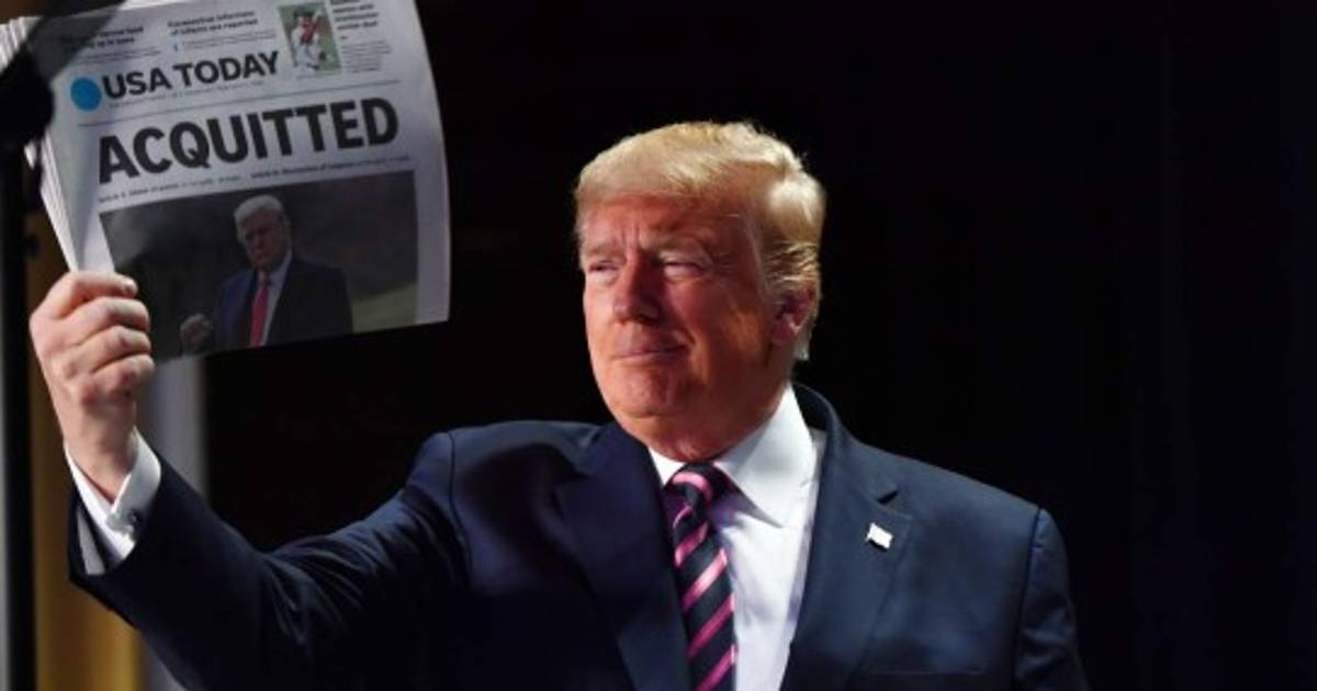 Tras su llegada a la ceremonia, presidida por Pelosi, Trump levantó triunfalmente las portadas de dos diarios anunciando su absolución.