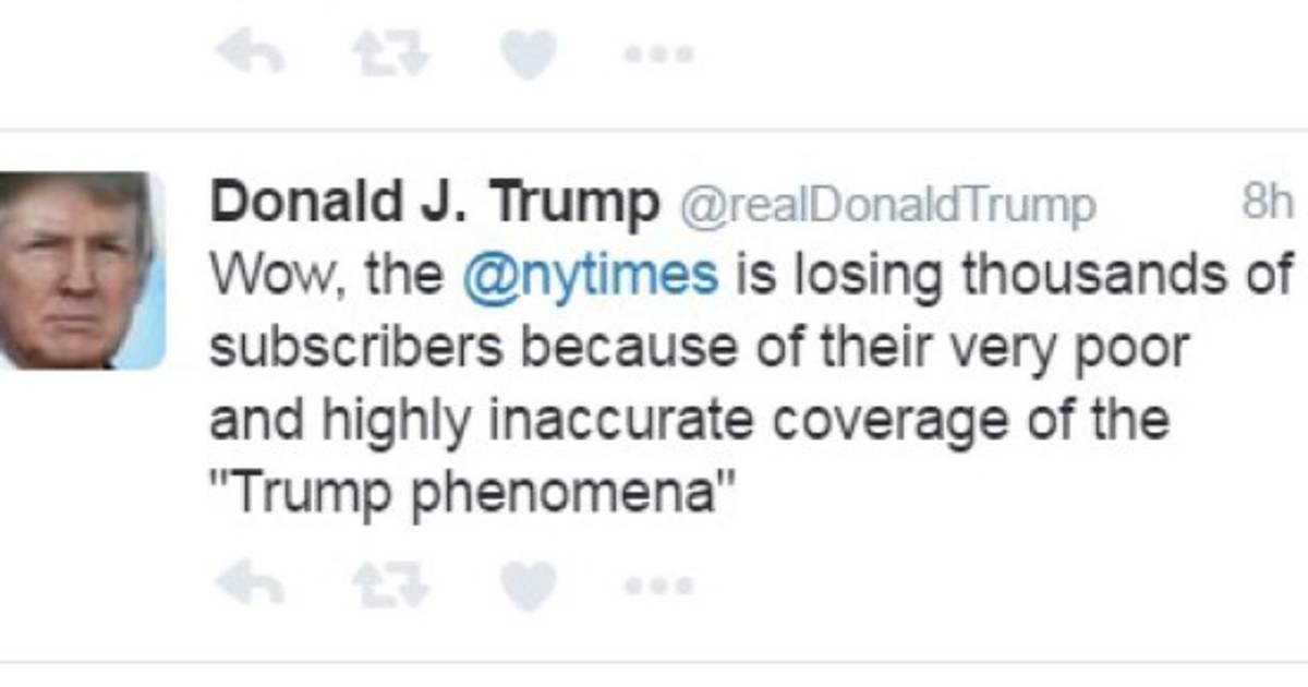'Wow, el @nytimes está perdiendo miles de suscriptores por su muy pobre e imprecisa cobertura del 'fenómeno Trump',' tuiteó el magnate de 70 años temprano este domingo, atacando la cobertura de las elecciones del diario.