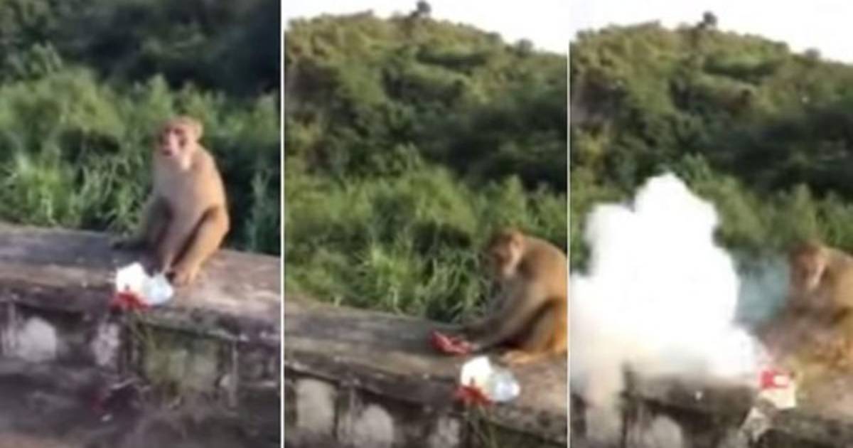Unos turistas insensibles colocaron dentro de una bolsa que parecía comida, un petardo, con el propósito de que el mono que se encontraba en el lugar, llegara a abrir el paquete.