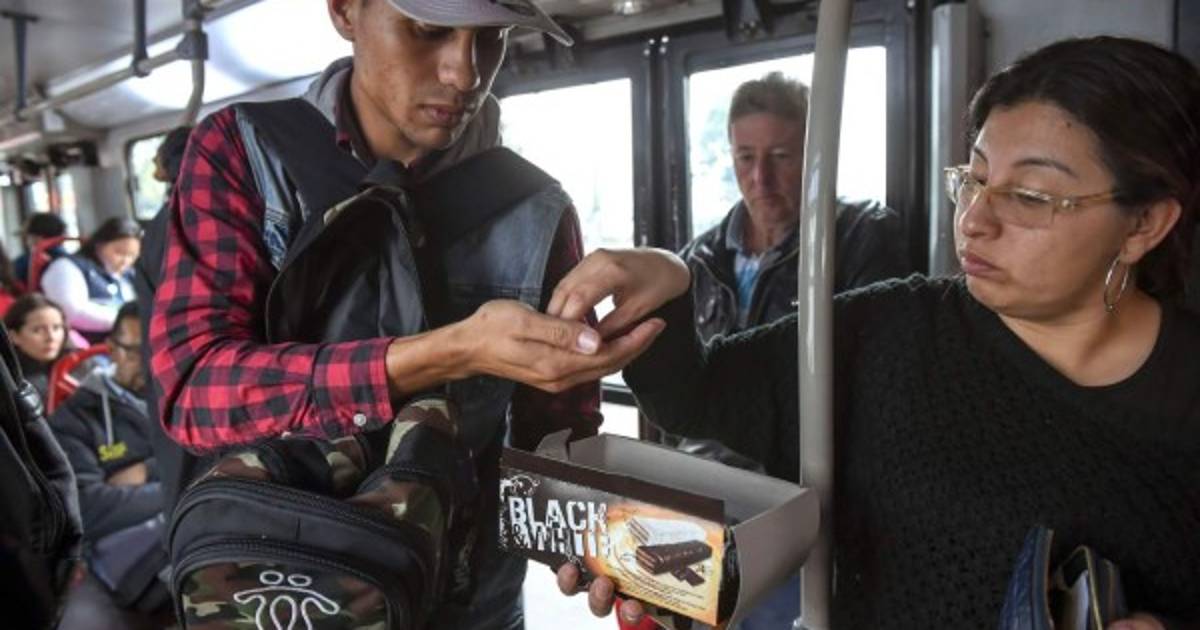 Jhonger Piña vende chocolates y galletas en el Transmilenio.