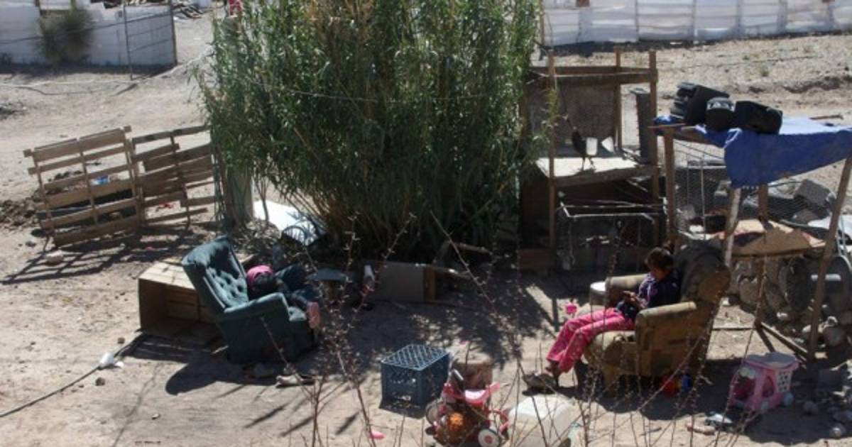 Dos niños descansan en los muebles de su improvisada casa en Ciudad Juarez.