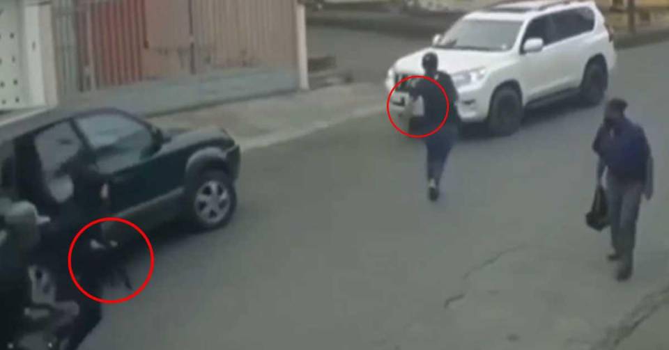 El video empieza cuando el conductor de la camioneta blanca es interceptado por otro vehículo del cual se baja, casi de inmediato, un hombre con una pisto en mano apuntándole y después dos más.