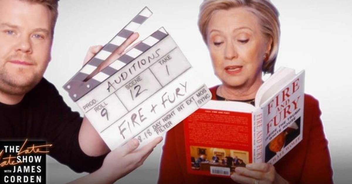 El anfitrión de la ceremonia James Corden presentó un video en el cual varias celebridades y Hillary Clinton leen extractos del libro 'Fire and Fury: dentro de la Casa Blanca de Trump', una crítica periodística al primer año de su presidencia.