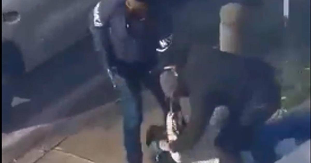 En el video se puede ver que la mujer está en el suelo sosteniendo su bolso en la mano mientras dos hombres armados intentan quitárselo.